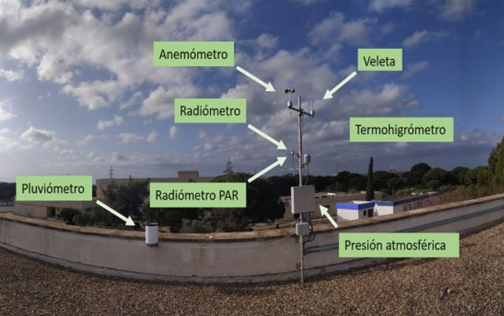 La estación meteorológica permite el monitorio continuo de diversos parámetros ambientales gracias a la instrumentación instalada. Está provista de sensores que registran automáticamente: temperatura, humedad, velocidad y dirección del viento, presión atmosférica, radiación, radiación PAR y precipitación con una elevada precisión. Estos datos meteorológicos son leídos y preprocesados por medio de un datalogger IQ300 a una frecuencia de 10 segundos. A continuación de detalla la instrumentación y sus especificaciones: