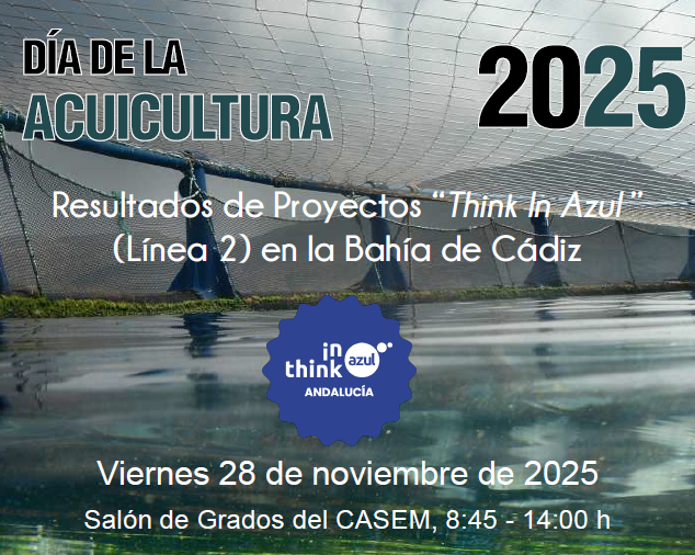 Con motivo del Día de la Acuicultura 2025, se organiza la jornada titulada “Resultados de Proyectos Think In Azul (Línea 2) en la Bahía de Cádiz” en la que participarán los investigadores responsables (IPs) de los diferentes proyectos desarrollados en el marco de ThinkinAzul Andalucía de la línea L2 (Acuicultura Sostenible, Inteligente y de precisión) en el ámbito geográfico de la Bahía de Cádiz. Los IPs expondrán, de una manera sencilla y dinámica, los resultados de sus proyectos.