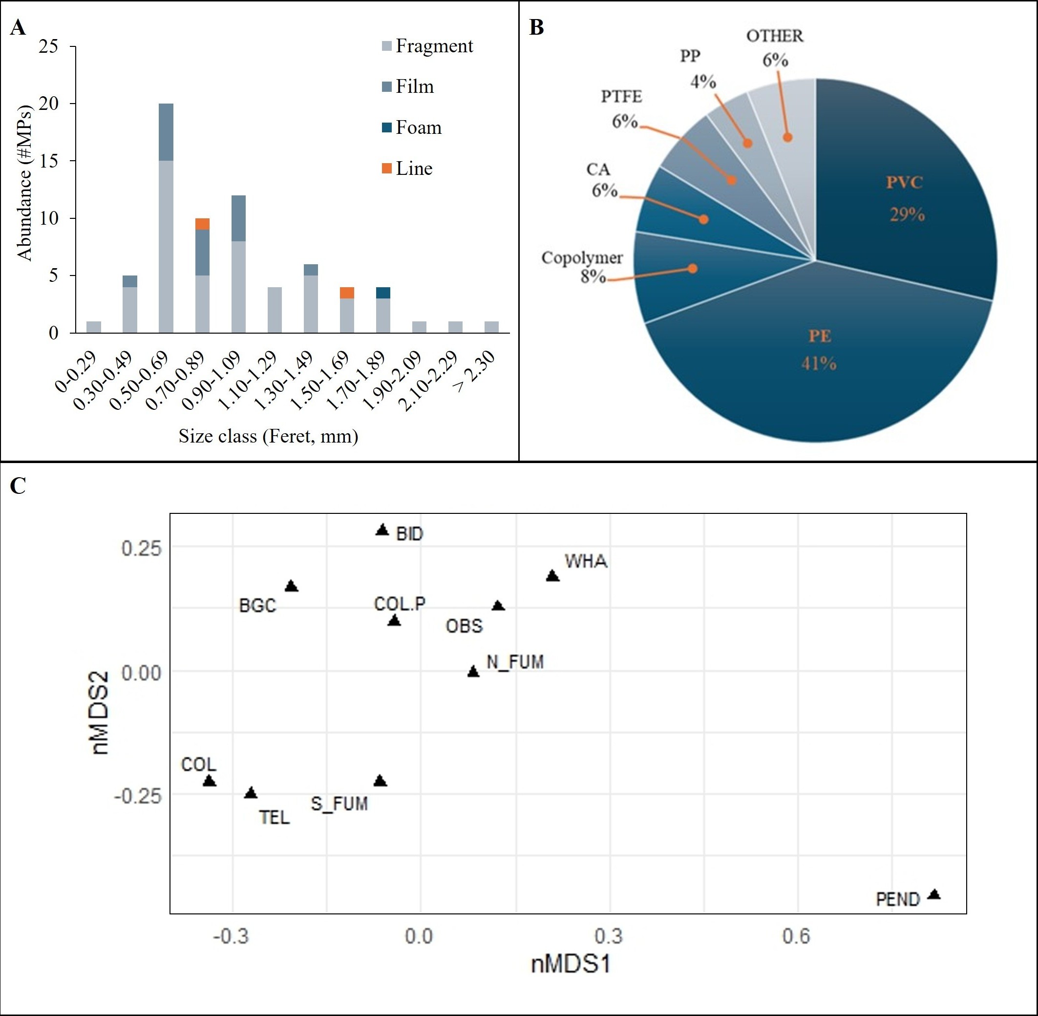 Los microplásticos presentaron predominantemente colores ámbar y verde, con un claro predominio de tonalidades claras. Junto con su pequeño tamaño medio, estas características apuntan a procesos avanzados de envejecimiento, ya sea ocurridos in situ o durante el transporte a larga distancia.