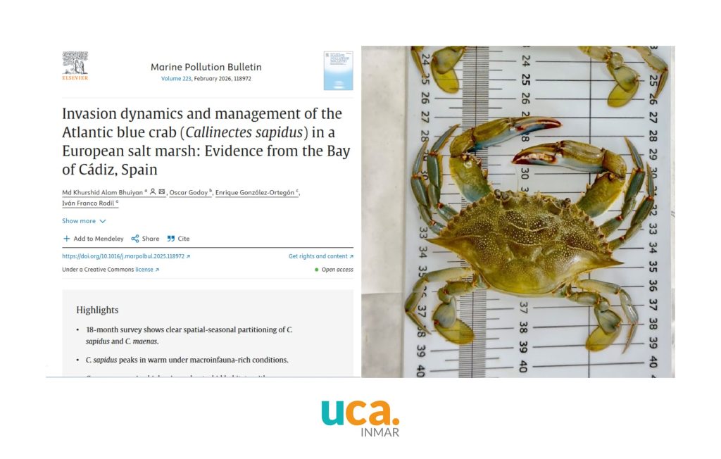 Un estudio recién publicado en Marine Pollution Bulletin confirma que el cangrejo azul atlántico (Callinectes sapidus), una especie invasora, está ampliando su presencia en el histórico paisaje de salinas y esteros de la Bahía de Cádiz. La investigación se desarrolló en Estero Natural, donde durante siglos se han utilizado estanques mareales para el cultivo de peces y ostras. El título del artículo es: Invasion dynamics and management of the Atlantic blue crab (Callinectes sapidus) in a European salt marsh: Evidence from the Bay of Cádiz, Spain.